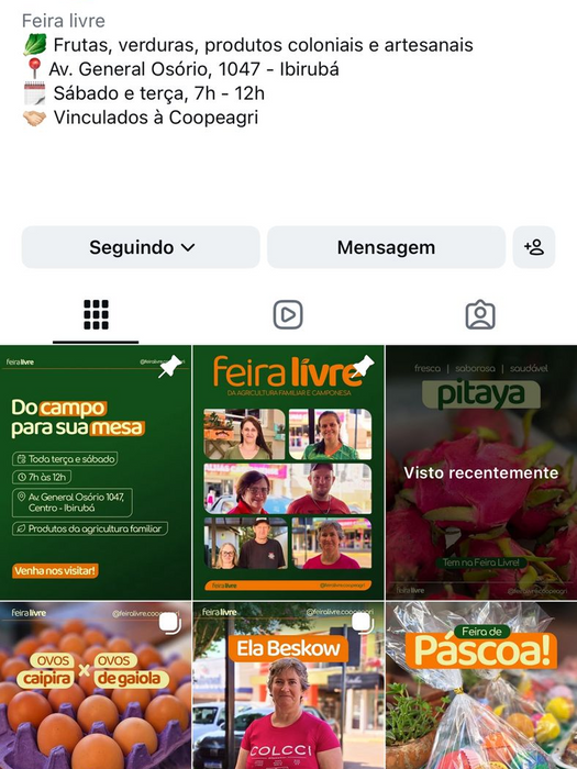 No perfil @feiralivre.coopeagri, você encontrará atualizações sobre os produtos frescos, eventos especiais, promoções exclusivas e histórias inspiradoras das famílias que fazem parte da feira, além de conferir novidades e dicas sobre os produtos disponíveis.